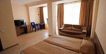 В номере: двуспальная кровать, диван-кровать, новая мебель, холодильник, кондиционер, телевизор (75 каналов), душ, туалет, умывальник, персональный балкон с летней мебелью, мини-сейф, фен. Площадь номера — 27-30 кв.м. Возможно размещение до 4 человек, доп. место - диван. При размещении 3-х, 4-х человек доп. место оплачивается отдыхающими любого возраста.
