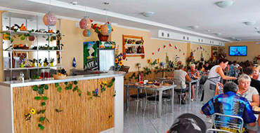 Питание организовано в двух просторных кафе, расположенных непосредственно возле корпусов. Завтраки входят в стоимость путевки. Обеды, ужины можно оплатить на месте, можно заказать заранее.