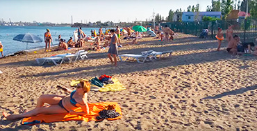 Просторный закрытый песчаный пляж. Шезлонги и зонтики - напрокат.